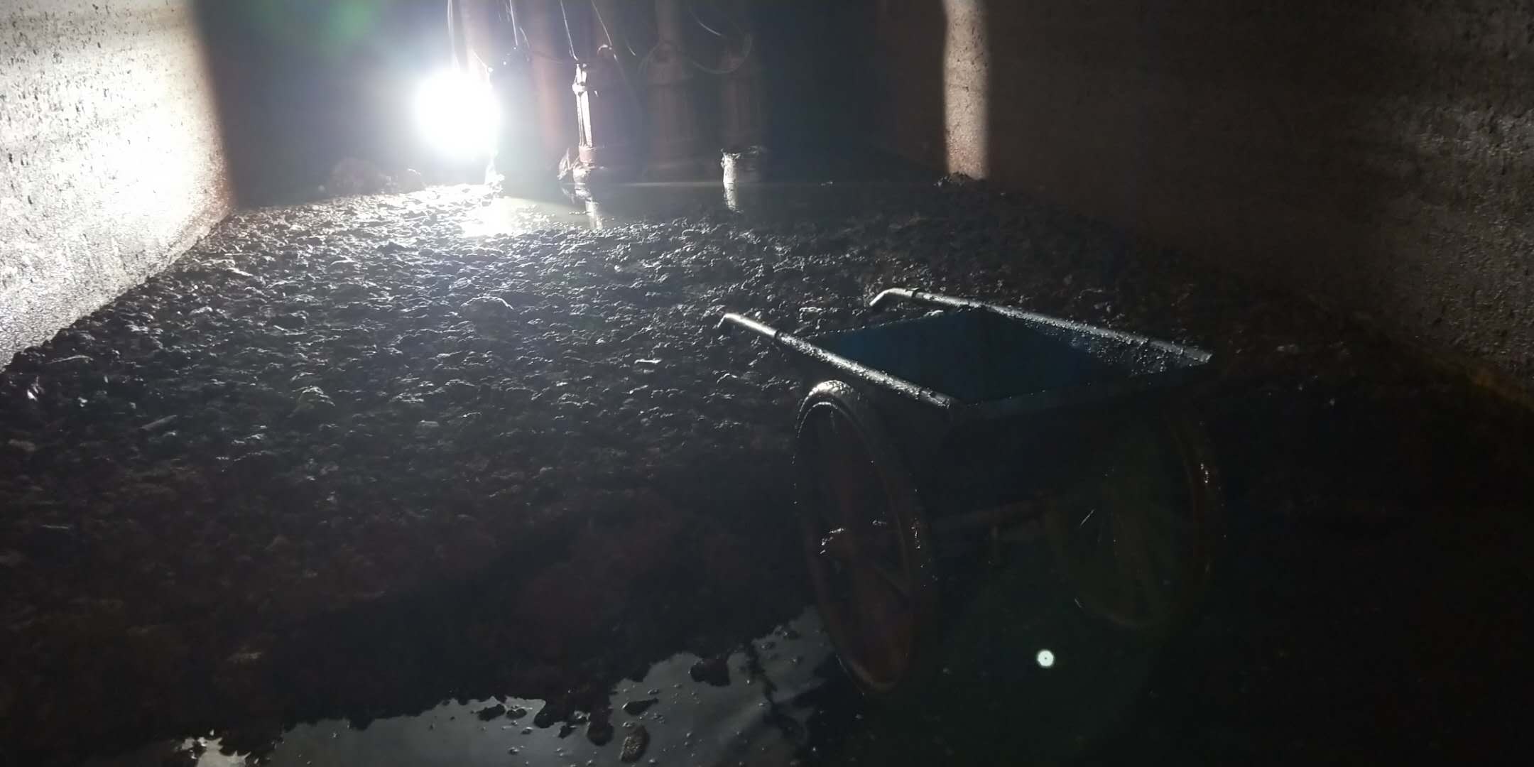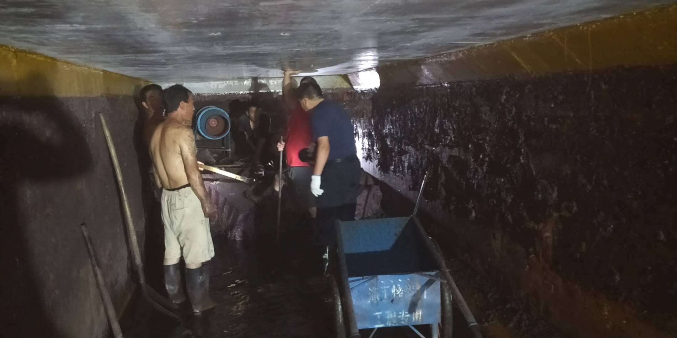 清淤行動(dòng)開始后,大家準(zhǔn)備好鐵鍬、鐵皮桶、手推車等工具,按照既定的行動(dòng)方案,分頭行動(dòng)。安技設(shè)備能源科副主管王緒身先士卒,一頭鉆進(jìn)通道,迎著刺鼻的氣味,踩著臟臭的淤泥,揮動(dòng)著鐵鍬,把淤泥鏟起。薛武、梁偉杰、張偉、史鵬輝、張波、竹元寶等六人排好隊(duì),輪流傾倒,他們互相協(xié)助,來回穿梭,配合默契。不一會(huì)兒,污水和淤泥就灌進(jìn)他們的褲腳,汗水浸濕他們的衣衫,但他們?nèi)詧?jiān)持清理,行動(dòng)迅速。他們心里想的只有完成任務(wù),只有為生產(chǎn)保駕護(hù)航的責(zé)任。
