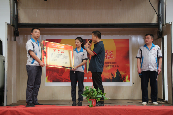 接著,市場處經理鄧力對公司9月份的任務量及目標進行了宣讀,將目標任務逐層進行分解,讓每一位銷售精英們做到心中有數,奮力拼搏。之后,本次活動最為核心的環節——營銷精英誓師,在市場處市場管理科主管吳曉旭激情昂揚地帶動下隆重開啟,吳主管組織各大區經理逐個上臺,面對現場全體干部員工,激情而又莊嚴地宣讀了9月份銷量目標軍令狀,并鄭重地按下手印,承諾:奮戰30天,使命必達!宣誓完畢后,公司領導為營銷精英們披綬帶,戴紅花,握手祝福,殷切預祝他們9月份旗開得勝、馬到功成,達成宣誓目標。