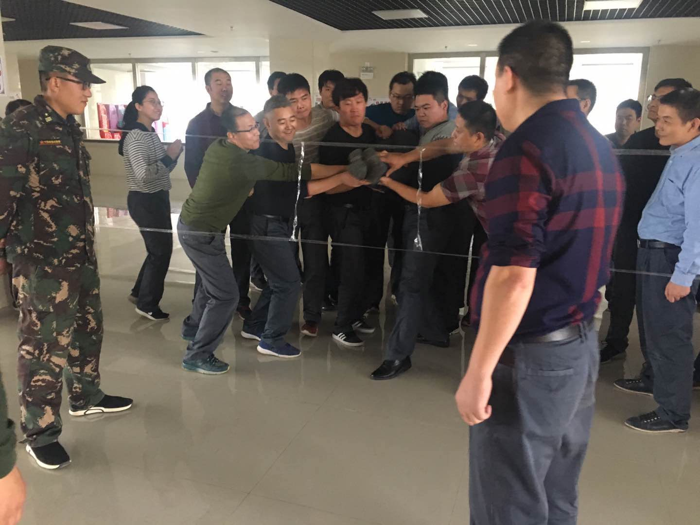 在開營活動中,培訓教官通過生動有趣的熱身游戲使干部們做到“三個忘記”:忘記年齡、忘記工作身份、忘記性別,使大家拋開一切,全身心的投入到訓練中。團隊組建環節中,大家組成四支斗志昂揚的隊伍,充分發揮團隊合作精神,集思廣益,“起隊名”、“唱隊歌”、通過不同的造型展示自己團隊最好的精神風貌。在“支援前線”和“搶灘登陸”環節中,四支隊伍你追我趕,互不相讓,每個人都發揚不怕吃苦、無私奉獻的精神,為了團隊的榮譽,有的干部甚至脫掉了外套、鞋子、襪子,光腳站在水泥地上,為團隊榮譽而戰,力爭第一;最后的“穿越電網”環節,活動雖然失敗三次,但是仍然不放棄,在隊長和指導員的帶領下,總結經驗,發揮團隊凝聚力和執行力,終于在第四次的行動中,成功完成挑戰,歡呼聲響徹訓練場,每個人的臉上都洋溢著成功的喜悅。